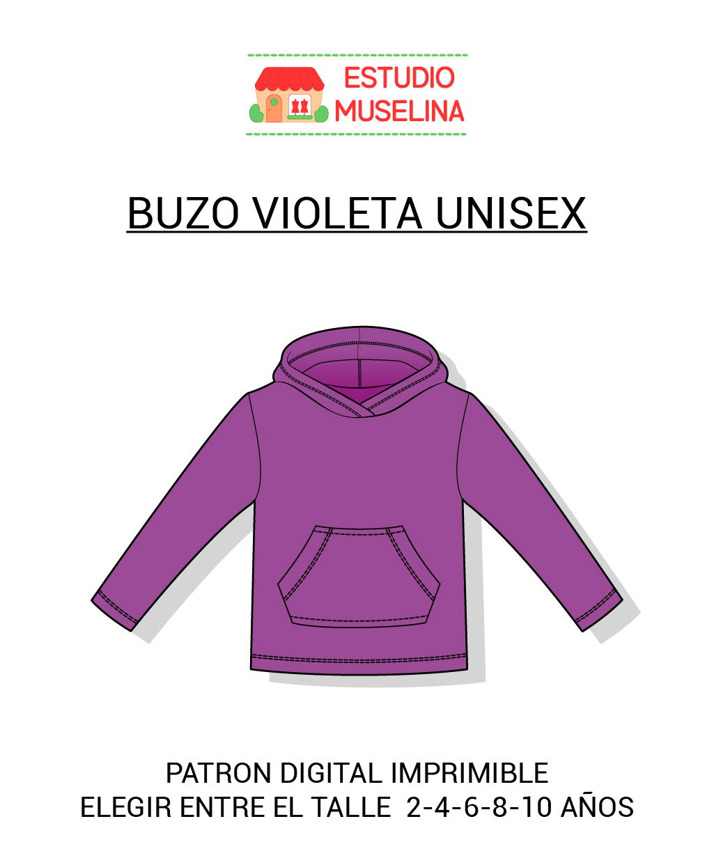 El buzo está diseñado para confeccionarse en tela de punto (frisa, rústico o polar liviano, etc) y viene con las costuras incluidas. Es recto y con capucha, llega a la línea de la cadera, tiene una amplitud de aprox. 10 cm del contorno de pecho de la tabla de medidas, con ruedo y puños dobladillados, así como el orillo de la capucha, viene con un bolsillo central al frente tipo canguro.