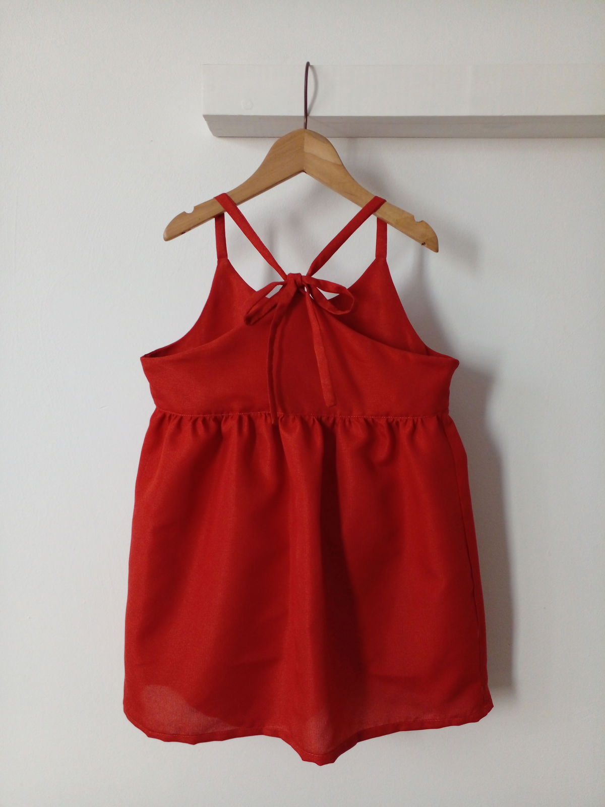 El vestido está pensado para coser con costura común o costura francesa, no necesitás usar overlock, y para ser confeccionado en una tela plana liviana tipo poplín, cloqué, batista, etc. Tiene un canesú embutido y corte princesa con una falda fruncida. En los hombros lleva breteles finos que se atan por la espalda con un moño o lazo. Es de línea suelta, tiene una amplitud de aprox. 6 cm del contorno de pecho de la tabla de medidas y se puede confeccionar con máquina familiar.