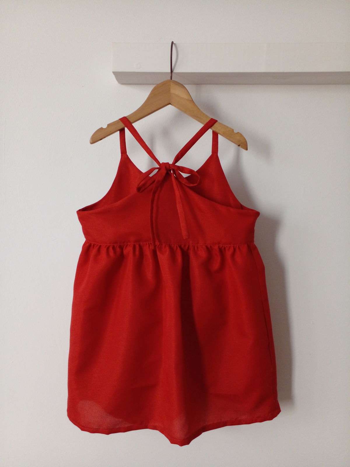 El vestido está pensado para coser con costura común o costura francesa, no necesitás usar overlock, y para ser confeccionado en una tela plana liviana tipo poplín, cloqué, batista, etc. Tiene un canesú embutido y corte princesa con una falda fruncida. En los hombros lleva breteles finos que se atan por la espalda con un moño o lazo. Es de línea suelta, tiene una amplitud de aprox 6 cm del contorno de pecho de la tabla de medidas y se puede confeccionar con máquina familiar.