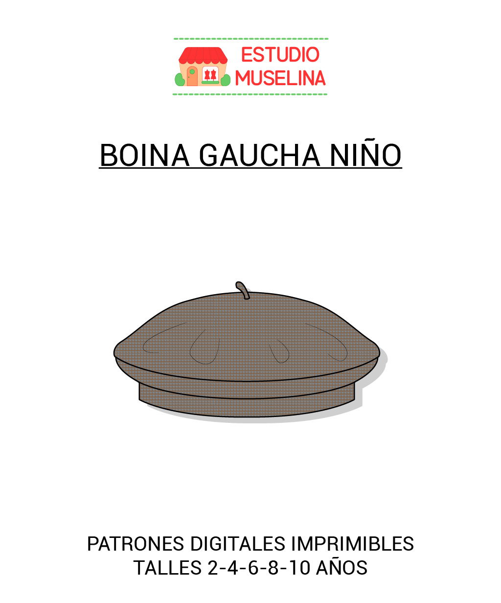 Molde digital para confeccionar una boina para niño, incluye 5 talles agrupados y diferenciados por líneas distintas, luego del armado del plano del molde, se puede recortar un talle o calcar cada talle para tener los 5 separados . Es ideal para emprendedores.