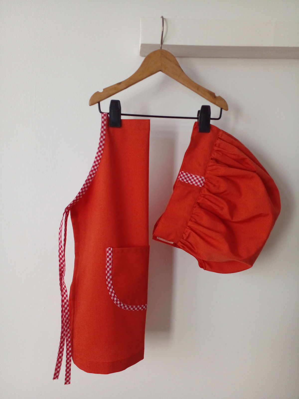 El conjunto está diseñado para confeccionarse en tela plana ( poplín, batista, gabardina, jean, etc. ) y viene con las costuras incluidas. El delantal tiene un bolsillo central. Es ideal para coser con máquina doméstica , los lazos se resuelven con cinta al bies.