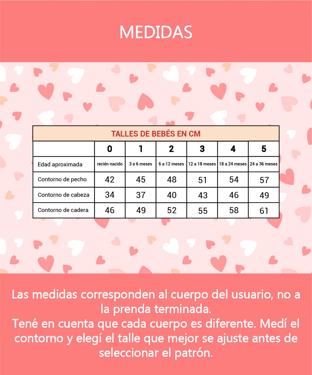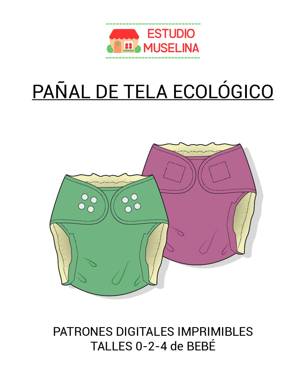 El pañal está diseñado para confeccionarse en tela plana, posee broches en el delantero, para regular el crecimiento del bebé, (los broches pueden ser reemplazados por velcro).