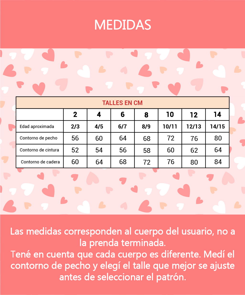 Incluye una ficha de Instrucciones super detallada, con plano de corte en tela abierta y doblada, ficha de medidas de prenda terminada, y un paso a paso con fotos y dibujos de cómo armar la prenda.