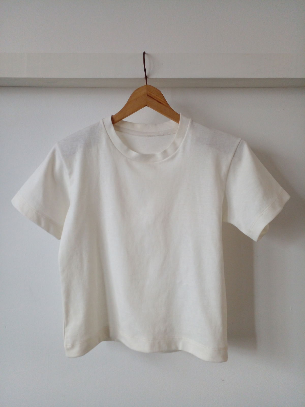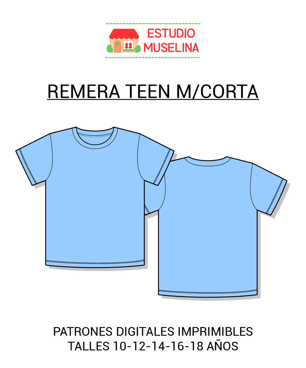 La remera está diseñada para confeccionarse en tela de punto ( jersey o similar ) y viene con las costuras incluidas. Es recta y termina en la línea de la cadera, es suelta al cuerpo sin ser oversize, el molde del cuello está pensado para ser cortado en la misma tela ( no es molde de reeb ), tiene dobladillos en ruedo y puños para ser terminados con tapacosturas o similar.