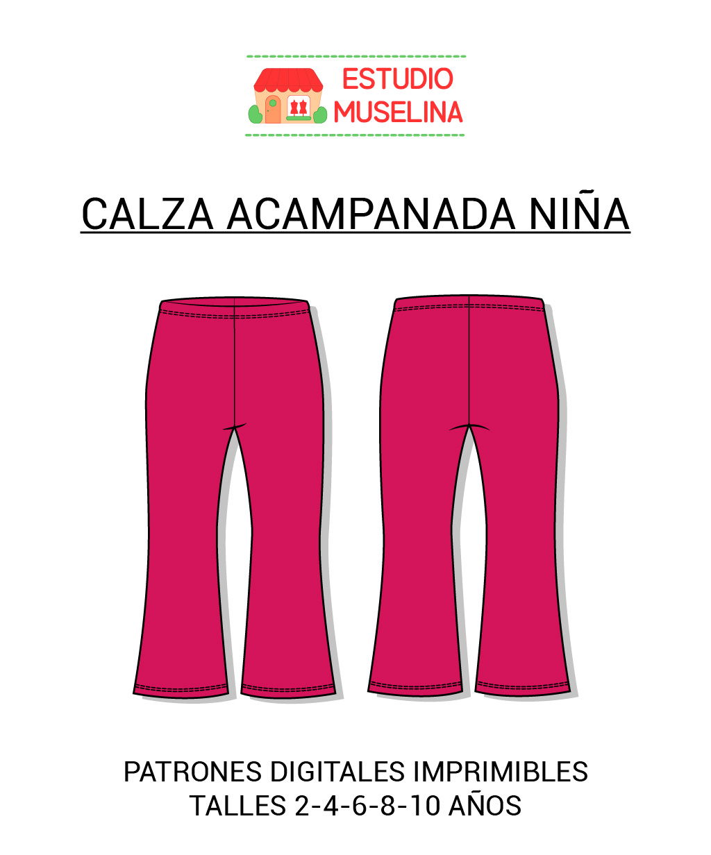 Molde digital para confeccionar una calza acampanada, incluye 5 talles agrupados y diferenciados por líneas distintas, luego del armado del molde, se puede recortar un talle o calcar cada talle para tener los 5 separados . Es ideal para emprendedores.